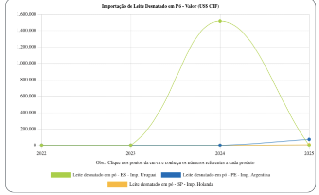 ESPECIAIS05 Dez 2025 Fonte: Comex Stat – Elaborado: www.terraviva.com.br Produto considerado nesta análise: NCM 4022120 – Leite parcialmente desnatado, em pó, etc., com um teor, em peso, de matéria gorda não superior a 1,5%, sem adição de açúcar ou de outros edulcorantes. |