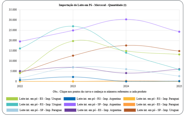 Entre os países do Mercosul, o principal fornecedor de leite integral em pó é a Argentina, seguida de Uruguai e Paraguai, enquanto do lado brasileiro os maiores estados de desembarque são São Paulo (SP), Espírito Santo (ES) e Rio Grande do Sul (RS), que concentram a maior parte do volume internalizado.