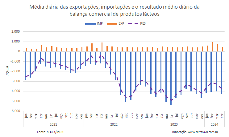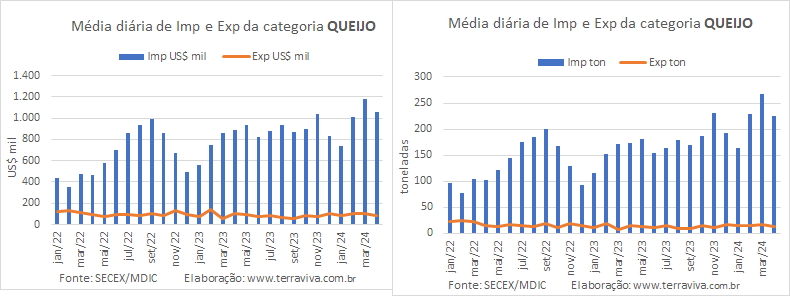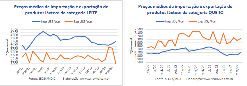 Assim sendo, é a categoria de maior peso na balança comercial brasileira de produtos lácteos. E como pode ser observado no gráfico, no mês de fevereiro e em menor medida em março, o volume exportado de produtos da categoria Leite aumentou na comparação interanual, e foram maiores até do que os volumes registrados em fevereiro e abril de 2022. E as importações de produtos da mesma categoria, que vinham caindo desde janeiro de 2024, voltaram a subir.