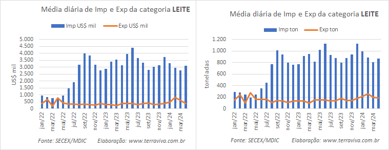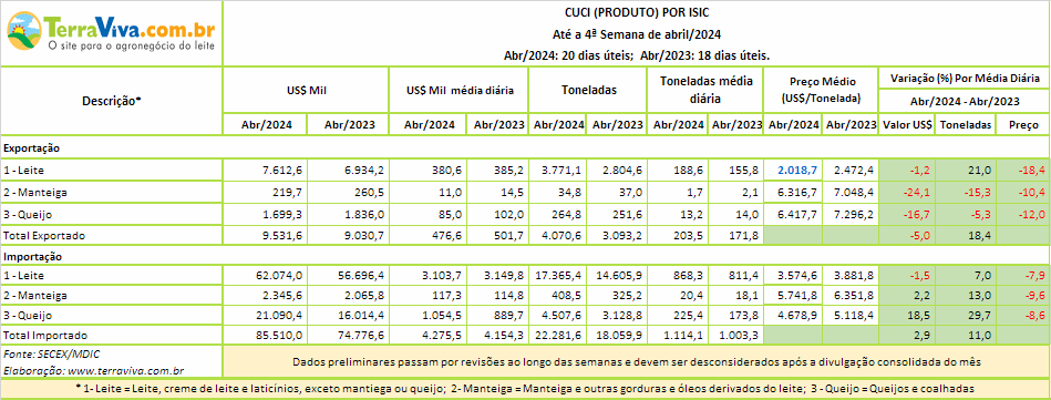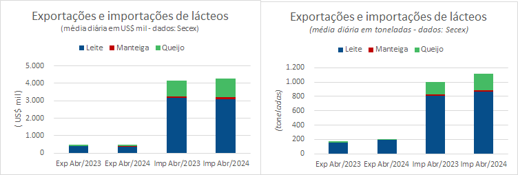 Os produtos da categoria Leite, representaram até a 4ª semana de abril, em volume, 92,6% das exportações e 77,9% das importações. Em valores os percentuais foram 79,9% das exportações e 72,6% das importações.
